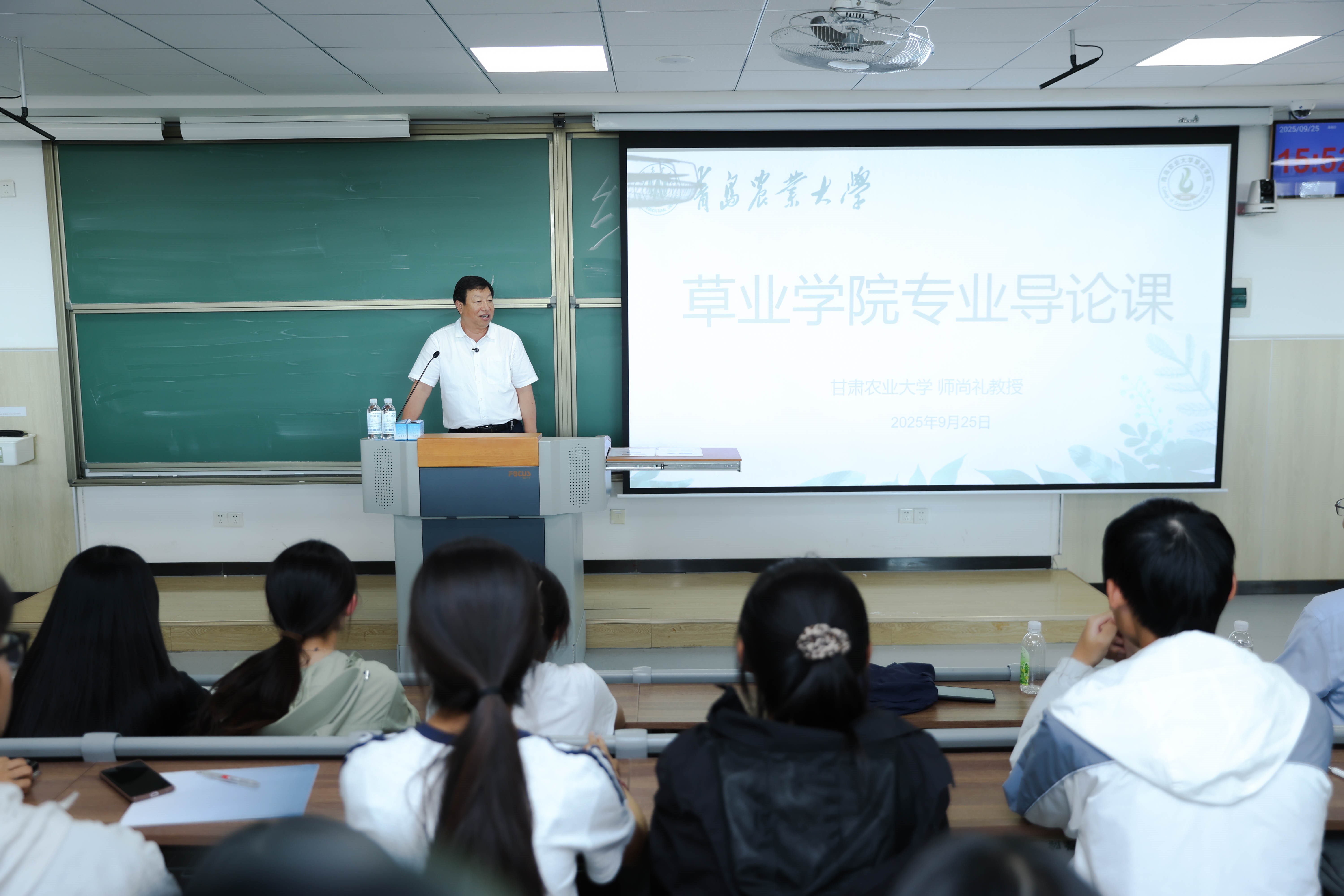 9月25日,甘肃农业大学师尚礼教授受邀到青岛农业大学草业学院平度校区为2025级新生讲授专业导论课。草业学院院长王增裕教授,党委副书记、副院长翟崑,辅导员盖越帅,全体2025级新生参加。