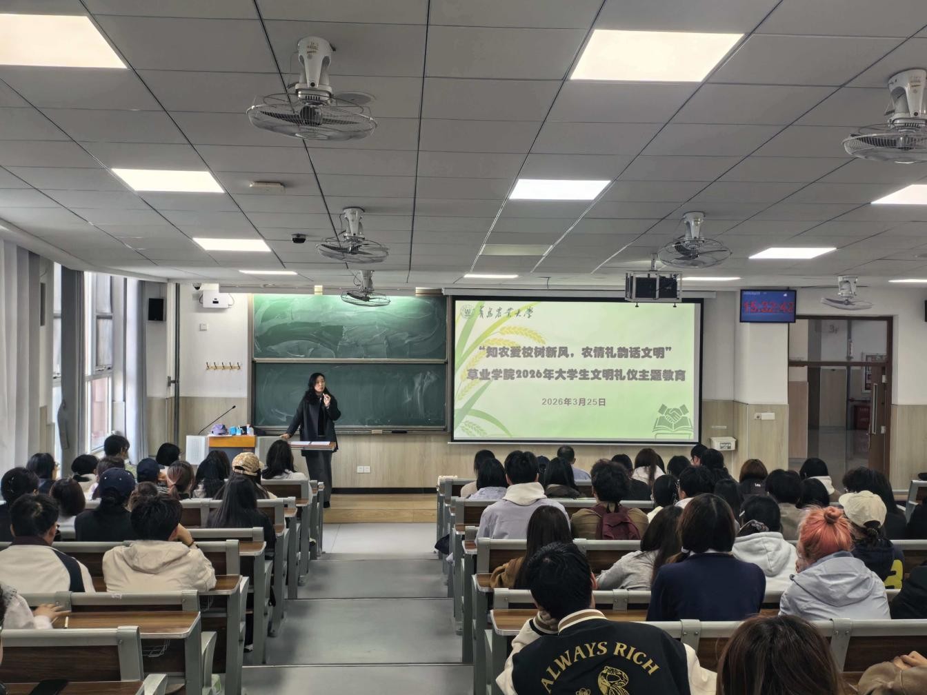 为进一步规范学生日常行为,营造文明和谐的校园氛围,3月25日,草业学院在平度校区召开“知农爱校树新风,农情礼韵话文明”大学生文明礼仪主题教育活动启动会。学院党委副书记、副院长孙贝贝,草业科学专业负责人王爱华,2025级班主任柴茂峰、陶奇波出席会议。会议由辅导员盖越帅主持,学院全体2025级本科生参加。
