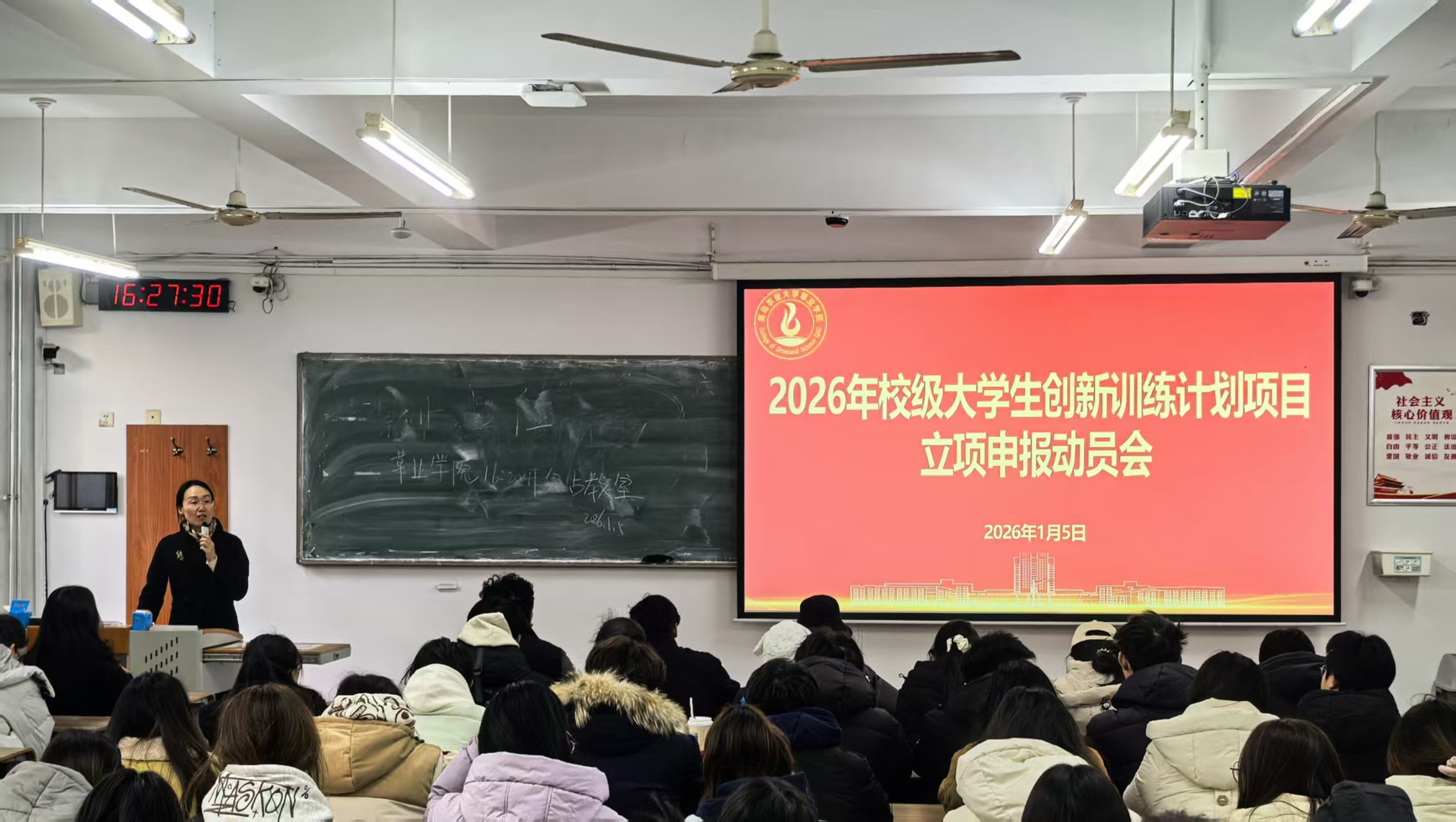 为强化学生创新实践能力培养,明确2026年校级大学生创新训练计划立项申报核心要求与实施路径,1月5日,创新创业学院副院长嵇安奕受邀为草业学院学生开展2026年校级大学生创新训练计划项目立项申报专题指导。草业学院党委副书记、副院长孙贝贝、辅导员刘雪勇及全体2024级本科生参加。